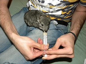 Začneme s krmením tak, že vypláchneme stříkačku horkou vodou či na minutu projedeme mokrou v mikrovlnce kvůli sterilizaci a napustíme dokrmovacím mlékem. Malou činčilku uchopíme jemně za tělíčko a v normálním postoji přistrčíme k pusince krmící stříkačku. Je možno mláďátka zabalit do ručníku a otočit bříškem nahoru a krmit jako lidské miminko. Mláďata se totiž pod samičkou krmí i otočená na zádech. Zkusíme kapnout činčilce na pusinku jednu kapku a čekáme jestli tekutinu přijme o olízne ji. Zezačátku to mláděti zachutnat nemusí a tak dostane jen pár kapek, o několik dalších krmení si ale zvykne a bude se již chtít krmit ze stříkačky samo tím, že ji bude olizovat.
